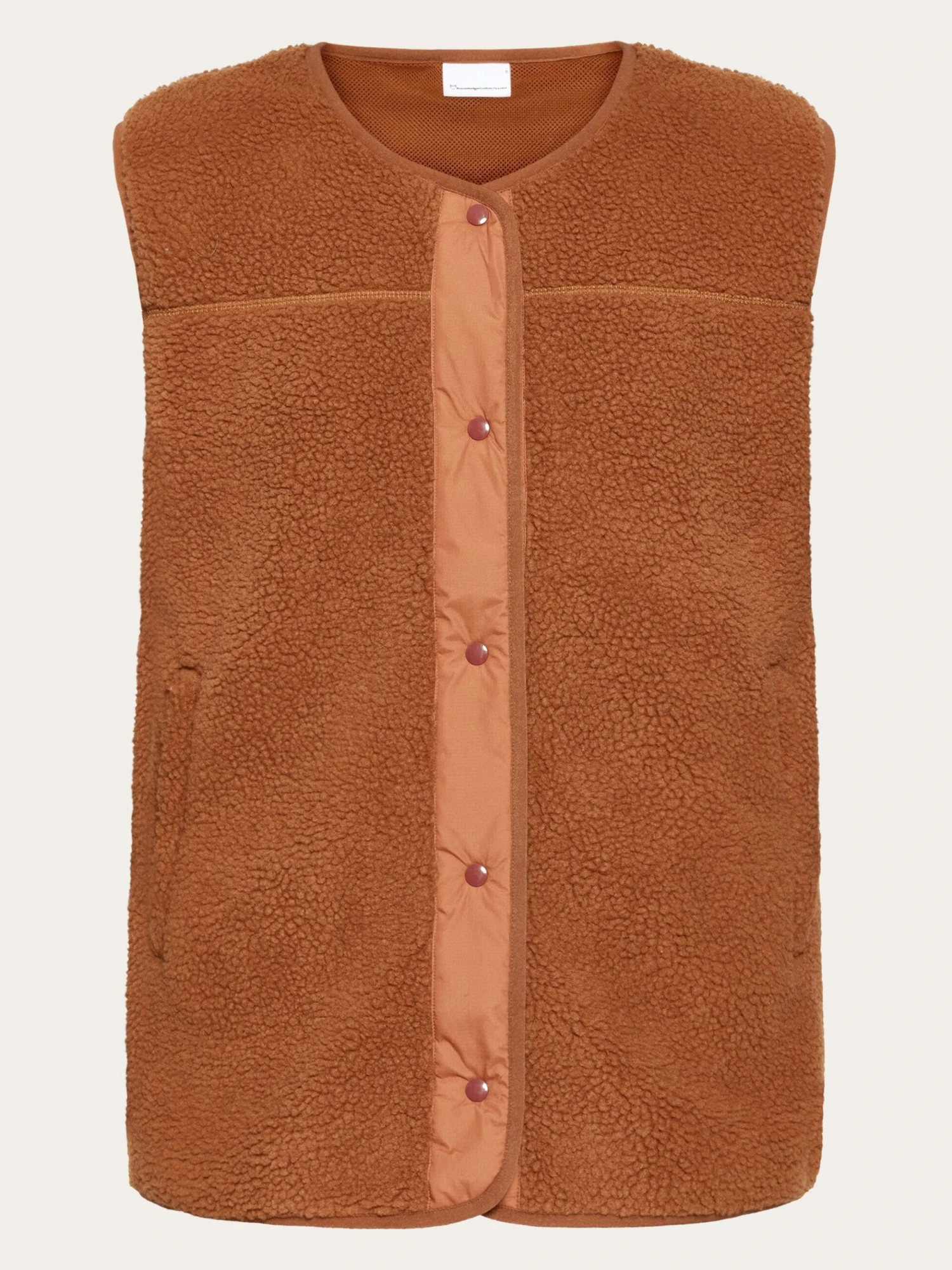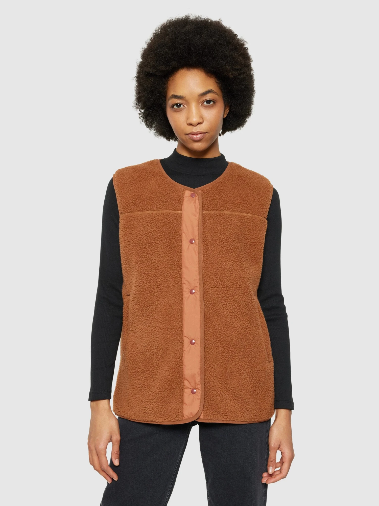 Stay warm and comfortable at all times with our teddy fleece vest. It is made from certified 100% recycled polyester in a soft, deep-pile fabric that feels like a fuzzy hug. The jacket is designed in a regular fit with a crewneck collar, zip pockets, and button closure.